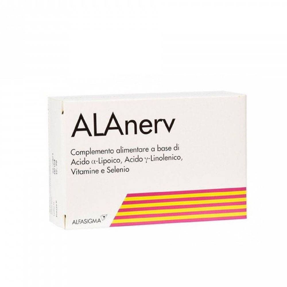 Alanerv is a food supplement based on alpha-lipid acid (a compound similar to vitamins), gamma-linolinacid (polyunsaturated fatty acid), vitamin E, vitamin B complex and seliconium, forming a product with antioxidant and neurovascular trophism characteristics.