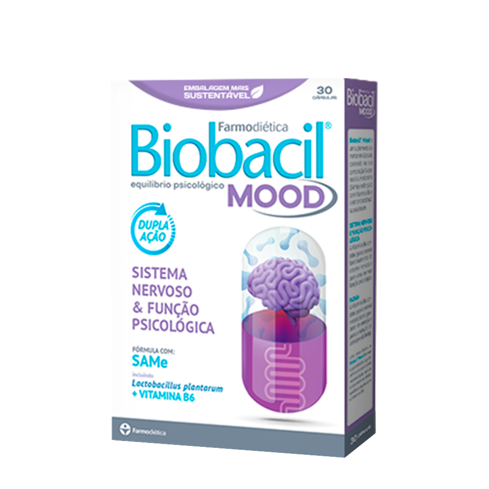 Biobacil Mood is a food supplement in capsules, containing S-adenosyl-L-methionine (SAMe) and reinforced with Vitamin B6 and the Lactobacillus plantarum strain. Vitamin B6 contributes to the normal functioning of the nervous system, normal psychological function, normal energy-producing metabolism and a reduction in tiredness and fatigue.